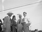 War Bond Loan Drive. Left to right, William Boyd, his wife, Grace Bradley, Mayor B. R. Wall of Grapevine, and Capt. E. J. Wynn, Boston Marine flier. This is a scene at Grapevine Thursday afternoon in one of a series of rallies staged to open the Third War Loan drive. This is taken outside, and Captain E. J. Wynn is holding a paper in his hand. Published in Fort Worth Star-Telegram, morning edition, September 10, 1943.