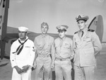 War Bond Loan Campaign, War Heroes. Joseph Toahty, Navy; Robert Underwood, Marines; John Larson, Army and Merritt Schoder, Merchant Marine. All four men each wearing their military uniform is standing side by side outside in front of an airplane. Published in Fort Worth Star-Telegram, evening edition, September 9, 1943.