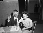 A War Bond Campaign to "Knockout the Axis" is being held at Will Rogers Memorial Coliseum. One of the many purchasers at the rally is Ned Lydick. He is shown buying $16,000 worth of "Back the Attack" bonds from Mrs. Mildred Bell. Mr. Lydick is dressed in a dark suit. Mrs. Bell is a military wife. Her husband, Sergeant Thomas Bell, is serving in New Caledonia. Mrs. Bell is wearing a dress with a bow on the front.