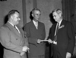 George H. Haynes (center) handing polio fund raising check to W. M. Massie as Jack Edwards looks on.