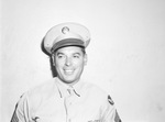 Sergeant D. E. Roncey Waters, Aerial Gunnery Instructor at Harlingen Air Forces Gunnery School, has been home visiting his father, J. M. Waters. In the photograph, Sgt. Waters is standing in front of a bare wall and smiling while he looks at the camera. He is wearing his Air force uniform and hat.
