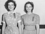 Texas Christian University freshman. Left to right, Peggy Glover of Pecos and Phala Davis of Hamlin, wore green ribbons with Fish printed on them when they registered at Texas Christian University Monday. When the caps arrive freshmen will exchange their ribbons for them. Published in Fort Worth Star-Telegram, evening edition, September 11, 1943.