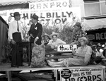 A themed War Bond Drive is being held in Fort Worth, Texas by the Junior Chamber of Commerce to support the war effort. Participating in the "Hillbilly Auction" are auctioneer George Barton and bidder H. D. Ackerman. The auctioneer's helpers, left to right, are four Jaycees - Jack Painter, Joe Pieringer, Al Purvis, and Tommy Marrs. Mr. Ackerman is bidding $5,000 for the sack of potatoes, which he later donated to the Lena Pope Home. He is dressed in a hat and a double breasted suit. Mr. Barton is wearing a hat, dress shirt, necktie, and trousers. The helpers are in "hillbilly" costumes. The booth is set up in front Renfro Drug Store.