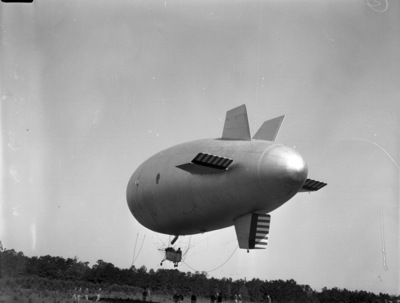 An observation balloon is shown to be mid-air and in the midst of being lowered by winches to the ground. On the ground is a group of military personnel looking up at the aircraft. On the balloon itself there are five small wings, three of which have dark stripes.