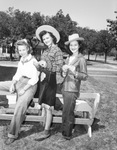 Practicing for Party: Texas Women's College (TWC), co-eds are practicing up on their cigarette-rolling for the "Western Trek" party to be given by the Women's Athletic Association for new girls on the campus at 8 pm. Wednesday in Sycamore Park where chuck wagon chow will be served. They are, left to right Camille Patterson, senior from Hubbard, and Emalee Hart and Merlene Ross, freshmen from Eastland. Three female students outdoors are in western wear and "saddled up" up on a wooden bench. Each one is holding a cigarette. Two of them (middle and right) are wearing cowboys hats. All are smiling. Published in The Fort Worth Star-Telegram morning edition, September 15, 1943.