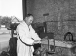 Mr. Watkins has 169 men under his supervision and 233 pieces of rolling equipment. In the photograph, Mr. Watkins is working on some equipment. He is wearing a stripped coat and has a long sleeve shirt and tie underneath.