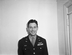 Major Charles H. Giddings Jr., flying fortress pilot is the son of Mr. and Mrs. C. H. Giddings. Mrs. Giddings Jr. is the former Mary Lane Mosby, daughter of Mrs. C. K. Mosby. In the photograph, Major Giddings is standing in front of a bare wall and is wearing his military uniform . He has participated in combat and has flown for several missions. He received a Silver Star with Oak leaf cluster, the Distinguished Flying Cross and Air Medal with Oak leaf cluster. He also wears the 19th Bombardment Group's four-citation Blue Bar. In the background, there is a partial view of a door and its hinge.