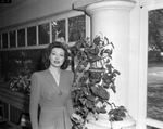 Actress Greer Garson, photographed on the porch of the Texas Children's Home & Aid Society (later known as Edna Gladney Home), 3130 Ave. H in Fort Worth, Texas.