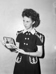 Miss Dorothy Bradshaw. In the photograph, Miss Bradshaw is wearing a dress with a collar and embroidery design on the shoulder and the pockets on the dress close to her waist. She is holding a photo album and is looking sideways. She is standing in front of a bare wall.