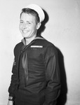 Boatswain Mate 2nd Class W. R. Darrow, son of Mr. and Mrs. Roy Darrow. W. R. Darrow is wearing his uniform. He is standing in front of a bare wall and smiling.