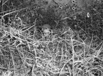 Corporal O.D. Harold, is shown here hiding in high grass, seen with his head raised above ground wearing a helmet. Published in Fort Worth Star-Telegram.