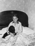 Bobby Sumner and his dog. The photo shows a boy sitting in a bed. He has a smile on his face and is looking directly at the camera. The lower part of his body is covered by a floral bedspread. Leaning up against the left side of the boy is a dog, "Trouble" with its paws in the boy's lap. Behind the boy is a pillow and a headboard with a decorative motif in the middle. Also on the bed, left side by the pillow, is a comb. The bed is surrounded on two sides by a wall covered in floral wall paper. He is the son of Mr. and Mrs. C. L. Sumner Junior.