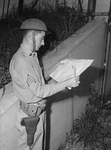 Texas State Guard (TSG) Shown here is Sergeant Emil Crow studying a map. Sergeant Crow is seen to be wearing a uniform. We can see a helmet strapped on his head and a firearm strapped to his waist.