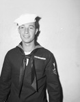 Arthur Bell, 21, aviation ordinance man, second class, and aerial gunner. The photograph shows shows Mr. Bell dressed in a sailor' uniform standing against a plain wall. He is looking at the camera and smiling. Mr. Bell was a former Panther Club Councilor.