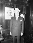 Governor John J. Dempsey of New Mexico. In the photograph, Governor Dempsey is standing in the corner of a room in front of a small, short grandfather clock. He is wearing a pin-striped suit jacket closed with one button, a shirt, tie and pin-striped suit pants. He is wearing a cowboy hat and has a handkerchief in the pocket of the suit jacket. There is a paneled wood wall behind him. Hanging on the wall is a portrait of Will Rogers. and to the right of the governor is a small statue of a boy.