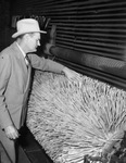 Harland Harvey Hester, superintendant of city street and garbage department. In the photograph, Mr. Hester is standing on the left side and has his left arm outstretched inspecting the bristles of a city street sweeper. He is wearing a suit jacket, diagonally, multi-colored tie, collared shirt and a western hat. There is a ring on his left ring finger. In his right hand he is holding a cigar. In front of him is the large grill of the street sweeper.