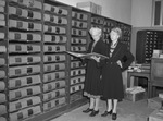 Mrs. Paul Baker, right, head of the Fort Worth Public Library History Department and Mrs. Nellie Pannill, supervisor of periodicals, are looking over the 1873 bound issues of the Daily Fort Worth Democrat. Published Fort Worth Star-Telegram Evening Edition October 7, 1943.