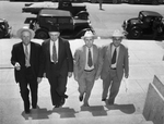 These four men traveled from Colorado City, Texas, along with ten others, to address the county jury on behalf of Joseph William Dunlap. They are, left to right, F. W. Beights, J. H. Carlock, A. K. McCarley, and O. J. Griffin. Mr. Dunlap is a 20-year-old former athlete and ministerial student at Hardin-Simmons University. He admitted to committing 14 burglaries of private residences. The four witnesses are walking up the courthouse steps. They are wearing hats and suits. Several automobiles are parked at the curb.