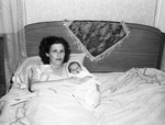 Mrs. Jack Gray and daughter, Jackie Carolyn, 7 day old infant. This will be the first glimpse Petty Officer Gray has had of the baby, born September 30. In the picture, Mrs. Gray is laying on the bed with her head resting on the pillow and headboard. She is holding her baby close to her side with one of her hands securing the baby on the side and the other one placed over her baby's hand. On the headboard there is a decorative mat placed at the center and the curtain showing a little to the side.