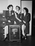 Three of the 13 people held prisoner during the Renfro Drug Company robbery are, left to right, Miss Bertie Mae McDonald, Miss Francis Jones and Miss Maurine McNeill. The women are sitting on one of the safes which helped to yield $2,000 cash and narcotics to two gunmen who took charge of the general office Friday evening. Miss McDonald and Miss Jones are bookkeepers. Miss McDonald is dressed in a blouse, blazer, skirt, and a necklace. Miss Jones is wearing a collared dress. Miss McNeill is a commercial artist. She is dressed in a blouse, blazer, skirt, and a bird brooch.
