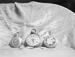 G. W. Haltom collection of watches. Shot of 3 fine old watches in the Haltom collection. Left to Right: an Ancient gold watch from India; a nine-ounce, man-sized oldtimer from Edinburgh, Scotland and a pearl-studded gold case, once owned by a Russian grand duke.