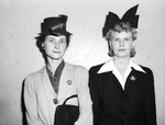 Left to right, Mrs. H. W. Jefferson appointed as major for the Alice Carlson School section, and Mrs. W. R. Christiansen, appointed as major for the George Clarke School. In the photograph, both women are standing in front of a bare wall and smiling as they pose for the camera.. Mrs Jefferson is wearing an inner blouse with a buttoned cardigan on top and a hat with feathers. She also has her purse under her left armpit. Mrs. Christiansen is wearing an inner collared shirt and a buttoned suit jacket with a big bow on her hair. They both have a circular pin with a triangle inscribed and the letters "CD" written inside the triangle attached to their jackets.