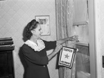 Mrs. Nora Denny is pictured taking down the gold-starred service flag that symbolized her son, Private First Class Joe C. Denny, reported to have died of pellagra in a Japanese prison camp, after reviving word from the War Department that he is still alive. Mrs. Denny is wearing a dress with a lace collar. The service flag has a star in the center and reads, "Served Our Country."