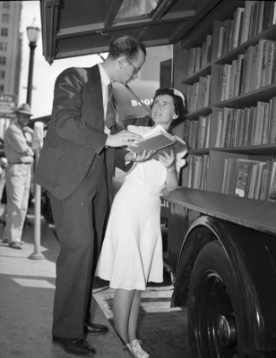 The Bexar County traveling bookmobile is making a stop in Fort Worth, Texas. Miss Juanima Wells, of San Antonio, Texas, is showing a book to Harry N. Peterson. Miss Wells is wearing a hat and a dress. Mr. Peterson is a Fort Worth, Texas, librarian. He is dressed in a suit.