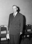Texas Governor Coke Stevenson, pictured during his visit to Fort Worth, Texas. Governor Stevenson was sponsoring the state's Women's Army Corps (WAC) recurring campaign. He is shown wearing a double-breasted suit and holding his hat in his right hand.