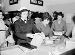 Packing Christmas gifts to send to soldiers overseas, left to right, Carline Rice, yoeman third class of the WAVES, Mrs. Raymond Fetter, and Mrs. W. E. Williams. In the picture, the women are shown in the post office wrapping their gifts to send to loved ones. Miss Rice is wearing her Navy uniform while the other two women are wearing long sleeve dresses. In the background are other unidentified people trying to mail packages. There are signs at the window kiosks behind them at the top on the walls which reads "Parcel Post".