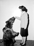 Rosalyn Graves, Star-Telegram reporter. In the photograph, Rosalyn is feeding sugar to Laura, performing Russian bear of the Polack Brothers Circus. They are both pictured in front of a bare wall. Rosalyn is wearing a suit jacket and skirt with two different colors and a collared inner shirt. She is posed side ways and all her focus is on the bear.
