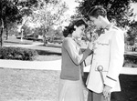 Texas Christian University (TCU) Band. Drum Major Frances Hall sewing a button for Bill Michero, drummer, son of Mr. and Mrs. W. A. Michero. In the photograph, Hall and Michero are standing outside on the lawn. Hall is wearing a dress and a cardigan. She is sewing a button for Michero, who is wearing his band uniform. They are both facing each other and smiling while Hall sews the button on. Michero has a drum stick in his left hand and his right hand is stretched out beside Hall's waist. In the background there are several trees and small bushes.
