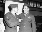 Technician Sergeant Frank Frucci, left, and Master Sergeant L. J. Arsenault. A picture of two men dressed in military uniforms embracing each other with friendly gestures.