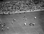 The Texas Christian University (T. C. U.) football team is hosting the visiting Texas Agricultural and Mechanical (A & M) Aggies (dark jerseys) at Amon G. Carter Stadium in Fort Worth, Texas. Early in the game, Aggie blocking back Bob Butchofsky broke free and streaked down the field. Passer Babe Hallmark found the open man for a 43-yard touchdown and the first score of the game. In coverage for the Frogs are Royal James (20) and James Lucas (40). On the defensive line are Dick Smith (71), Norman Morrill (61), Bill Marshall (80), and Billy Hale (50). The Aggies went on to win the game 13-0.
