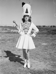 The Texas Christian University (T. C. U.) football team is hosting the visiting Texas Agricultural and Mechanical College (A & M) Aggies at Amon G. Carter Stadium in Fort Worth, Texas. Preparing before the game is Frances Hall. She is a sophomore at T. C. U. and the school's first girl drum member. The Lufkin, Texas, native is dressed in a band uniform and is holding a baton.