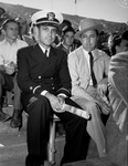 The Texas Christian University (T. C. U.) football team is hosting the visiting Texas Agricultural and Mechanical College (A & M) Aggies at Amon G. Carter Stadium in Fort Worth, Texas. Attending the game, left to right, are Ensign William S. Bryant and George Liser. Ensign Bryant graduated from T. C. U. in 1932. He is now a member of the United States Navy, and is stationed in Burwood, Louisiana. He is sitting in the stands, dressed in his military uniform. Mr. Liser is a hometown Frog fan. He is dressed in a cowboy hat and a suit.