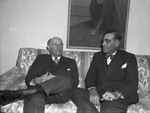 Tom M. Girdler, board chairman of Consolidated Vultee Aircraft, left, and T. D. Lebus, Lexington, Kenkucky. Two men sitting on a couch with a big painting on the wall above them.