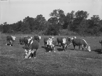 The Texas Experiment Station at Lufkin, Texas, staged a field day, where visitors could come see the East Texas farm and livestock there. Shown here is a typical bunch of Hereford cattle on the farm. They are standing in a grassy field. There are several trees in the background.