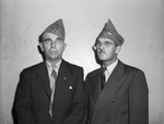 Left to right, Joe Atkins and V. E. Brooks, American Legionaires. A picture of two men standing up against a wall with pointy hats on.