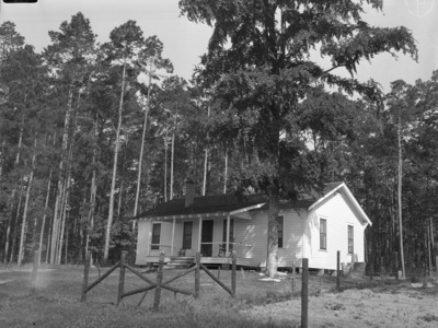 The Texas Experiment Station at Lufkin, Texas, staged a field day, where visitors could come see the East Texas farm and livestock there. Shown here is one of the houses for station employees. A rocking chair is on the front porch. The house is surrounded by a fence. There are several tall trees behind and around the house.