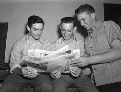 Three Polytechnic High School baseball players are checking their base knocks in the box scores of the sports section of the Fort Worth Star-Telegram. The players are, left to right, Cliff Peacock, Bobby Donaldson and J. C. Phillips. They are all hitting.350 or better. Cliff is wearing a pinstripe button-up shirt and pinstripe trousers. Bobby is wearing a checkered button-up shirt and trousers. J. C. is wearing a short-sleeve button-up shirt and pinstripe trousers.