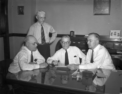 Discussing the success of the Fort Worth Stockyards Company's tour initiative are, left to right, A. A. Lund, Ed C. Walsh, A. G. Donovan and J. H. Hall. The initiative involved bringing 4-H Club and Future Farmers of America (FFA) members to visit the livestock market in Fort Worth, Texas. Mr. Lund is the general manager of Armour and Company. Mr. Walsh is with the Fort Worth Stockyards Company; he arranged the tour. Mr. Donovan is head of the Stockyards Company. Mr. Hall is the general manager of Swift and Company. All four men are wearing long-sleeve button-up shirts, neckties and eyeglasses. Lund, Donovan and Hall are seated at a rectangular desk, looking at a piece of paper; Walsh is standing.