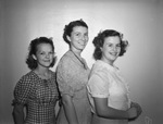 Sydneyanna Carter, center, Riverside High School senior, won the $10 first prize in the Colonial Dames essay contest. Her classmates, Aneita Jamar, left, and Barbara Fitzgerald, right, won third and second prize, respectively. The winning essay will be entered in the state contest against essays from seven other Texas cities. The students are standing against a wall. Miss Carter is wearing a floral print dress. Miss Jamar is wearing a checkered dress. Miss Fitzgerald is wearing a blouse with ruffles down the front and on the edge of the sleeves and a skirt.
