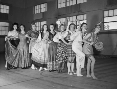 Dancers who will take part in the "Dance of Nations" program at Texas Christian University Stadium, in which 250 students will participate, are wearing costumes indicative of the folk dances they will execute. The dancers are, left to right, Gerry Browder, Doris Jean Tew, Marjorie Stevenson, Nellross Heister, Mary Laswell Ray, Courtney Wright, Frances Anderson, Ruth Simms and Rosella Porterfield. Miss Browder is wearing a Native American-style costume and is holding a small drum. Miss Tew is wearing a sailor-style shirt and trousers. Miss Stevenson is wearing a blouse with a matching checkered blazer and skirt. Miss Heister is wearing a long-sleeve blouse, floral print skirt and a hair scarf. Miss Ray is wearing a floor-length dress with long, puff sleeves and is holding a tambourine. Miss Wright is wearing a striped floor-length dress and a floral print vest. Miss Anderson is wearing a mid-length dress and a scarf around her neck. Miss Simms is wearing a short-sleeve floor-length dress. Miss Porterfield is wearing a long-sleeve blouse, trousers and a hat.