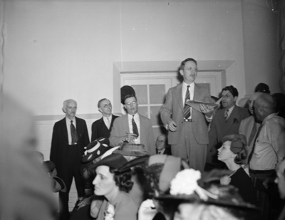 Arnold Davis, leader of a minority faction within the Tarrant County Republican convention, stood on a chair and began conducting a rump session after the majority convention had overruled a minority report. Supporting Davis were Alfred Crager (second from left), W. A. Brents (third from left), and Thomas E. Ball (on Davis' left). They are all wearing suits.