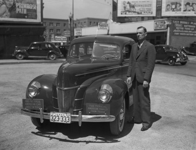 Dick Stubbs, of the Ford Motor Company, Dallas, Texas, standing next to a garnet colored deluxe Ford automobile. Stubbs is wearing a suit. The car's license plate number "323-333." There are two other plates on the front of the car, one reading "Ford- The Typical American Car Built In Texas," and the other, "The Typical American Family From Texas." The Fort Worth Star-Telegram and the West Texas Chamber of Commerce are sponsoring the Typical American Family Contest. The winning family of the contest will appear at the chamber's convention in Big Spring, Texas, and be driven in this car to the World's Fair in New York.