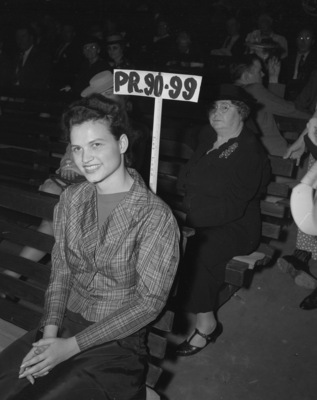 Miss Beth Lea, a veteran of four Casa Manana shows and a senior student at Texas Christian University, was one of the women delegates at the Tarrant County Democratic Convention at First Baptist Church. She is sitting on a bench, wearing a blouse, plaid blazer and a skirt. Behind her is a sign that reads, "PR. 90-99."