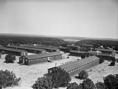 Seven barracks for the Civilian Conservation Corps (CCC) enrollees assigned to develop the park is shown in the picture. Work is to begin in early 1941. Nearly 7,000 acres of Brazos Valley land has been deeded to Texas for the newest park, Possum Kingdom State Park, near Breckenridge. The broad Brazos River valley is shown in the background. The river valley is to be transformed into a 67-mile long lake with the completion of Possum Kingdom Dam. Published in the Fort Worth Star-Telegram morning edition, October 13, 1940.