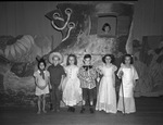 First and second grade pupils of Diamond Hill Elementary School presented the play, "A Visit to Nursery Street," in the school auditorium. Nancy Ann Williams is peering from the window in a set piece on stage. Standing on the stage, left to right, are Betty Hanson, Doyle Harrell, Nancy Ann Cagle, O. H. Reeves, Joyce Amon and Ruby Jean Moore. Their teachers, Mrs. Hazel Downs and Mrs. Alberta Murphy, directed the play. Betty is wearing a dress and costume rabbit ears. Doyle is wearing a short-sleeve collared shirt, trousers and a straw hat. Nancy Cagle is wearing a dress and bows in her hair. O. H. is wearing a checkered blazer and trousers. Joyce is wearing a dress and a ribbon in her hair. Ruby is wearing a striped dress and an apron and is holding a cane.