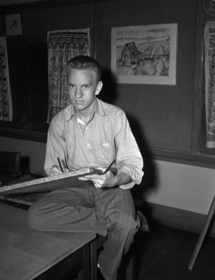 The Texas Big Bend Park Association is sponsoring a statewide contest to design the park's souvenir honorary deeds. The deeds are given to contributors to the Big Bend National Park. The winning Texas art student will receive a $25 cash prize. Merle McMillen is an Arlington Heights High School art student. He is sitting on top of a desk, sketching his entry. Merle is dressed in a striped button-up shirt and trousers.
